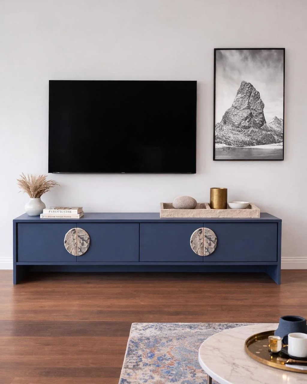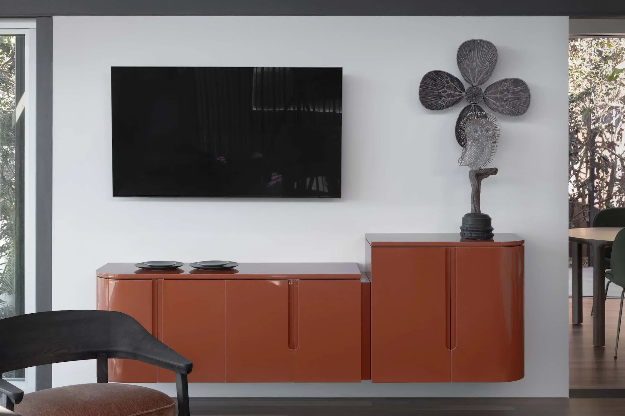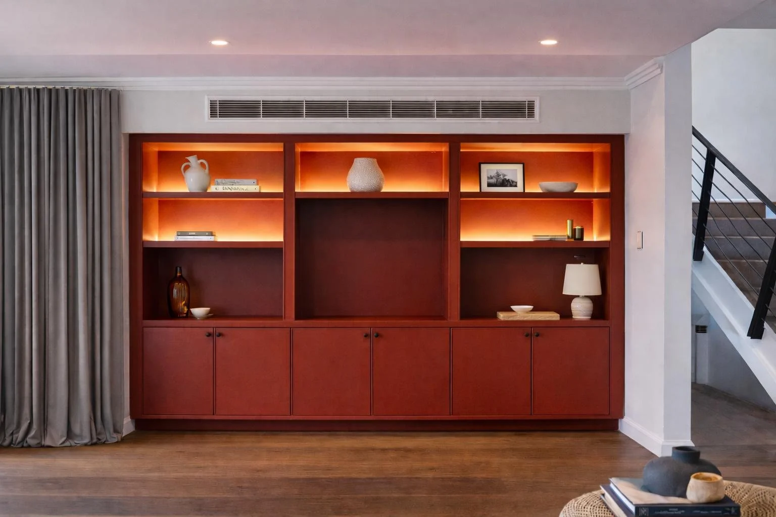 Entertainment units are becoming more architectural, built to sit seamlessly into walls and living spaces rather than stand apart. Shelving is being used as both storage and display, with colour adding depth and rhythm rather than distraction. Even practical storage is being rethought, with tonal finishes allowing it to disappear or gently anchor a space depending on the intent.